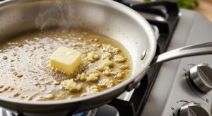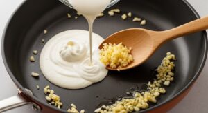 3- Prepare the Alfredo sauce base: Lower the heat to medium and melt butter in the same skillet. Add minced garlic and sauté for 1-2 minutes until fragrant but not browned.