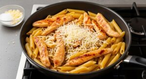 6- Combine pasta and chicken: Add the cooked penne and sautéed chicken strips back into the skillet. Toss gently so the pasta is evenly coated with the rich Alfredo sauce.