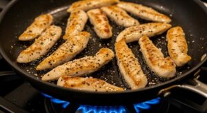 2- Sear the chicken: In a large skillet, heat olive oil over medium-high heat. Add the chicken strips, seasoning them with salt and pepper. Sauté untill golden brown and cooked through, about 6-8 minutes, turning halfway. Remove from skillet and keep warm.