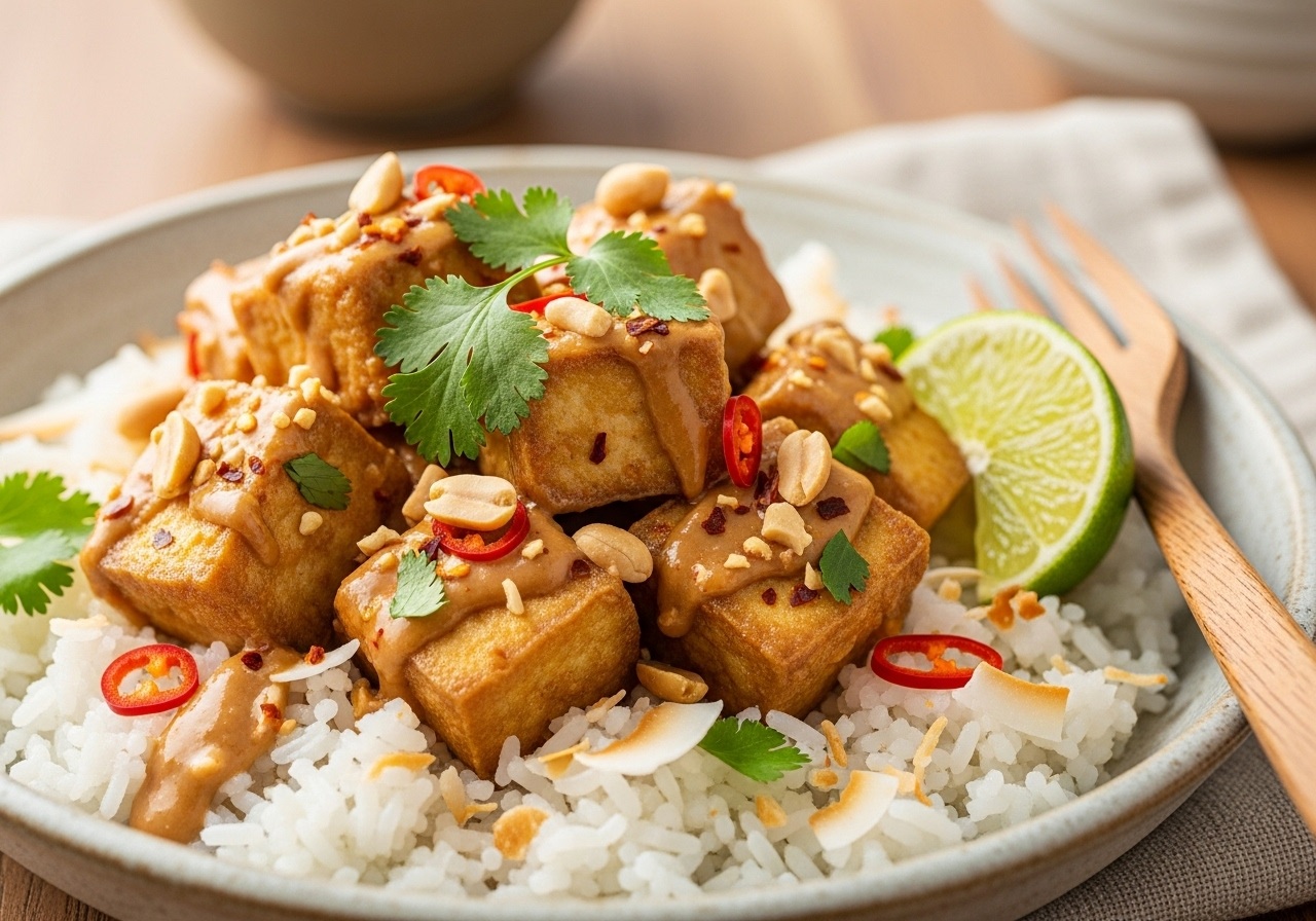 A1: This dish was born from a desire to marry contrasting textures and flavors-crispy, nutty tofu coated in a rich peanut sauce paired with the smooth, velvety sweetness of coconut-infused rice. It’s a playful dance between bold crunch and soothing creaminess, inspired by Southeast Asian comfort food traditions.