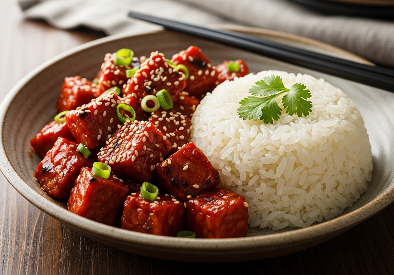 Fiery Gochujang Tempeh paired with perfect sticky rice is a sublime fusion of heat and umami that transforms simple ingredients into an irresistible feast. Inspired by Korean street food culture yet adapted for approachable home cooking, this dish brings together the smoky depth of fermented soybeans with the tangy, spicy richness of gochujang. Each bite bursts with sticky, caramelized tempeh cubes clinging lovingly to a bed of fluffy, slightly chewy rice – a contrast that excites and comforts all at once.