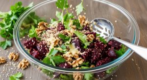 4- Assemble the Salad: In a large bowl, combine the roasted beets, fluffy quinoa, fresh parsley, walnuts, and baby greens if using.drizzle the dressing over and toss gently to coat every ingredient evenly.