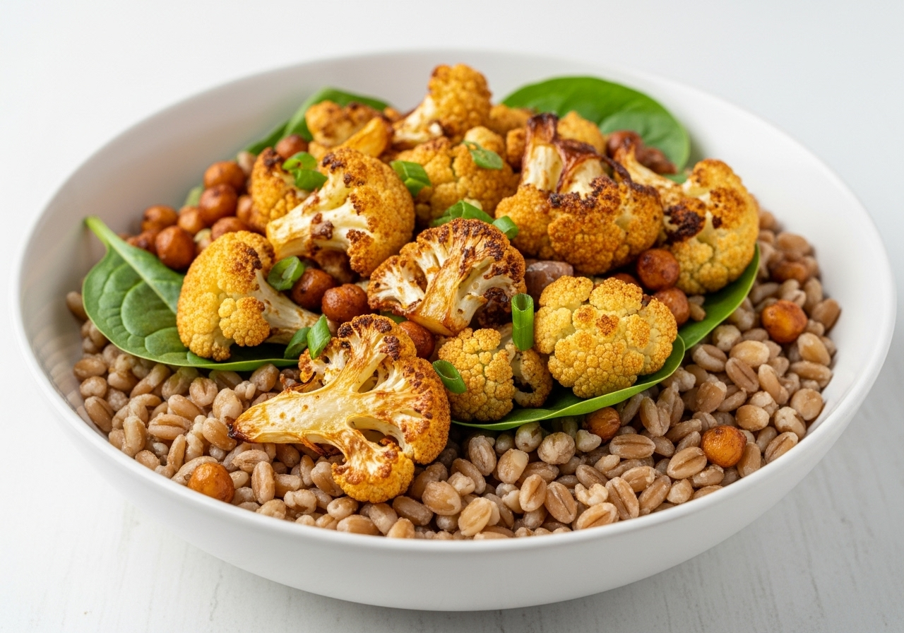 A3: Roasted cauliflower brings a satisfying caramelized flavor and crisp-tender texture, balancing the hearty spelt berries beautifully. Its mild, nutty taste compliments the wholesome grains and adds a burst of antioxidants and vitamins like vitamin C and K.